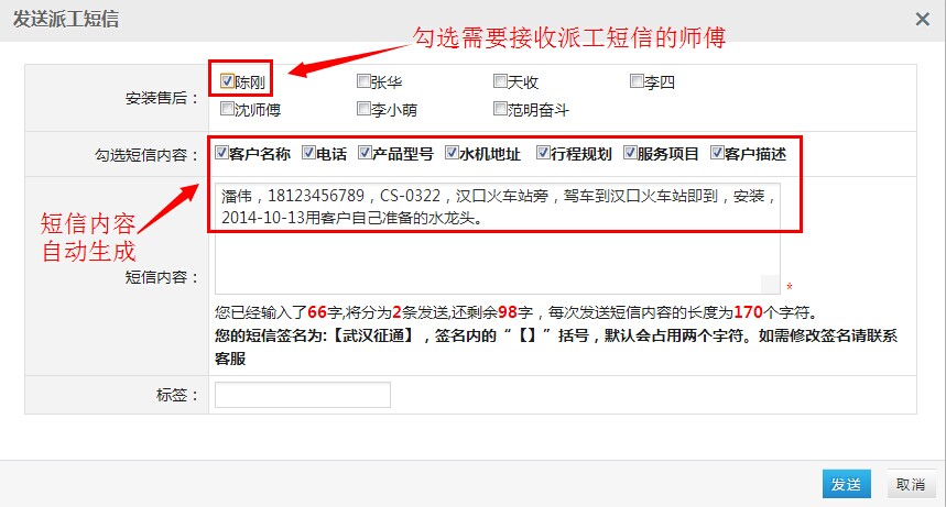 下图的派工页面可直接安排空闲的师傅上门服务,提交后系统会提示您打印派工单。